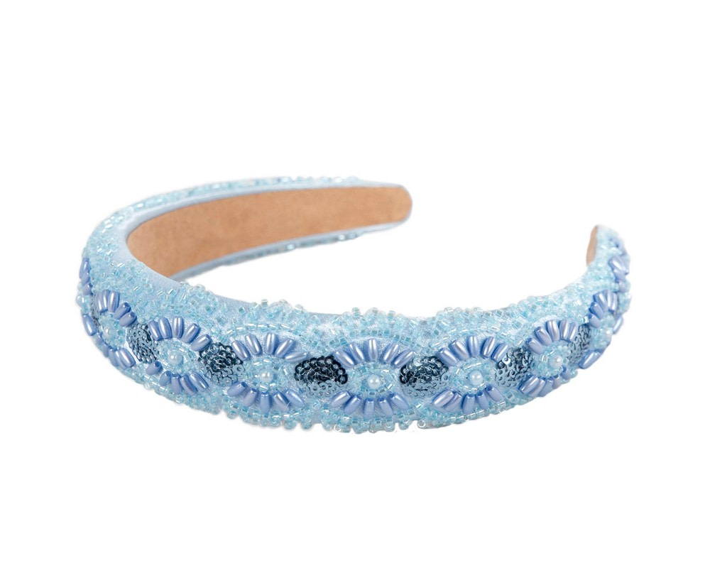 Light blue fascinator headband by Cupids Millinery. Comfortable headband covered in beads and crystals