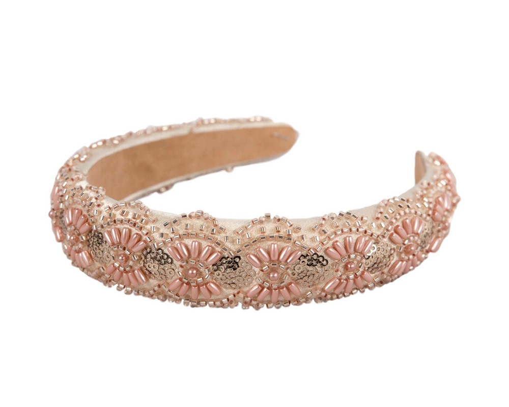 Rose Gold fascinator headband by Cupids Millinery. Comfortable headband covered in beads and crystals