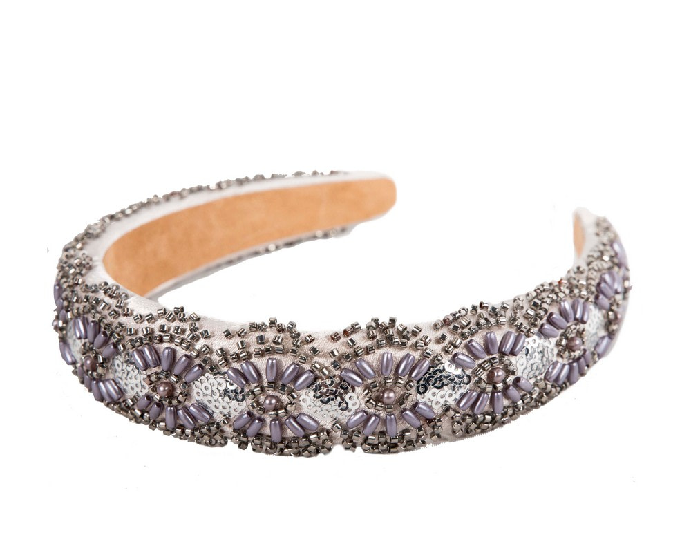 Silver fascinator headband by Cupids Millinery. Comfortable headband covered in beads and crystals