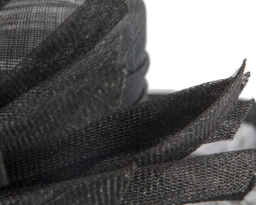 This black ladies fashion sinamay hat features classic shape with wide asymmetric brim and traditional crown. Hats is decorated with unique ornament made from matching sinamay. This hat will be a great addition to your next spring racing outfit.