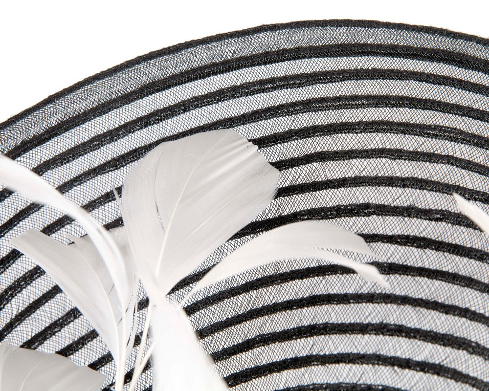 Exclusive one-off creation by Cupids Millinery Melbourne artisans. Large braided black crinoline base expertly shaped into a perfect racing accessory with addition of contrast white feather tree.