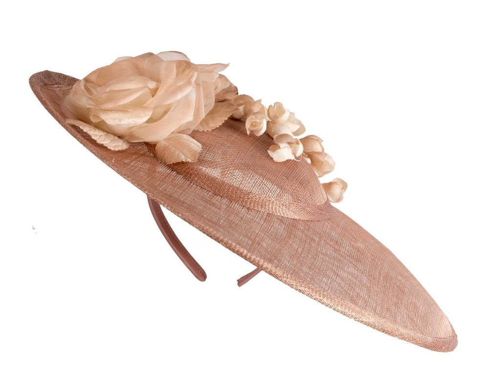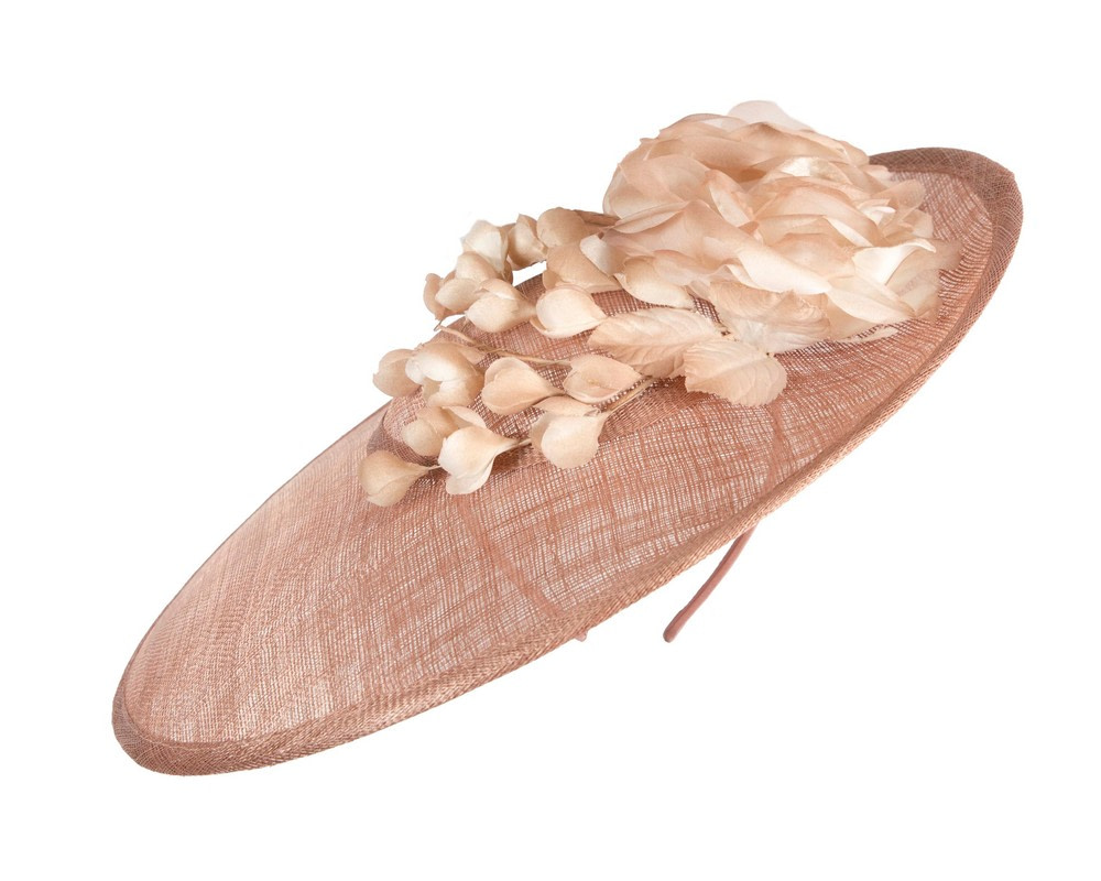 Large coffee sinamay fascinator hat with flowers by Max Alexander