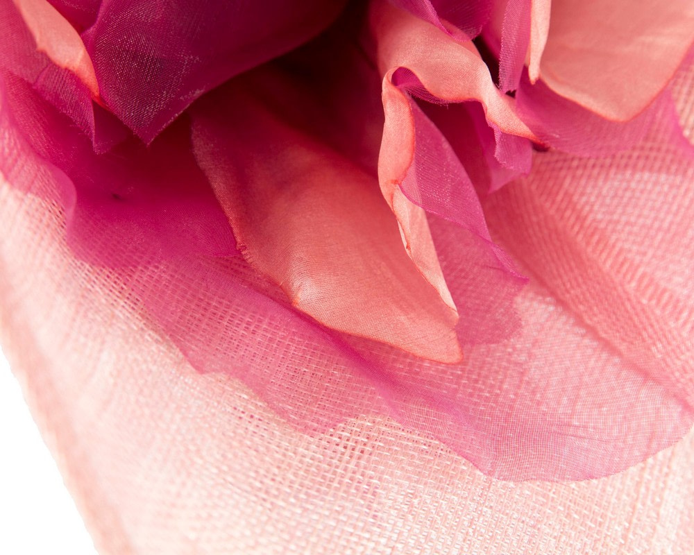Latest Fillies Collection racing fascinator. Large pink hat base, topped with hand-made silk flowers in all colors of sunrise, this fascinator will turn heads when you wear it at Melbourne Cup, Ascot or your local racing event.