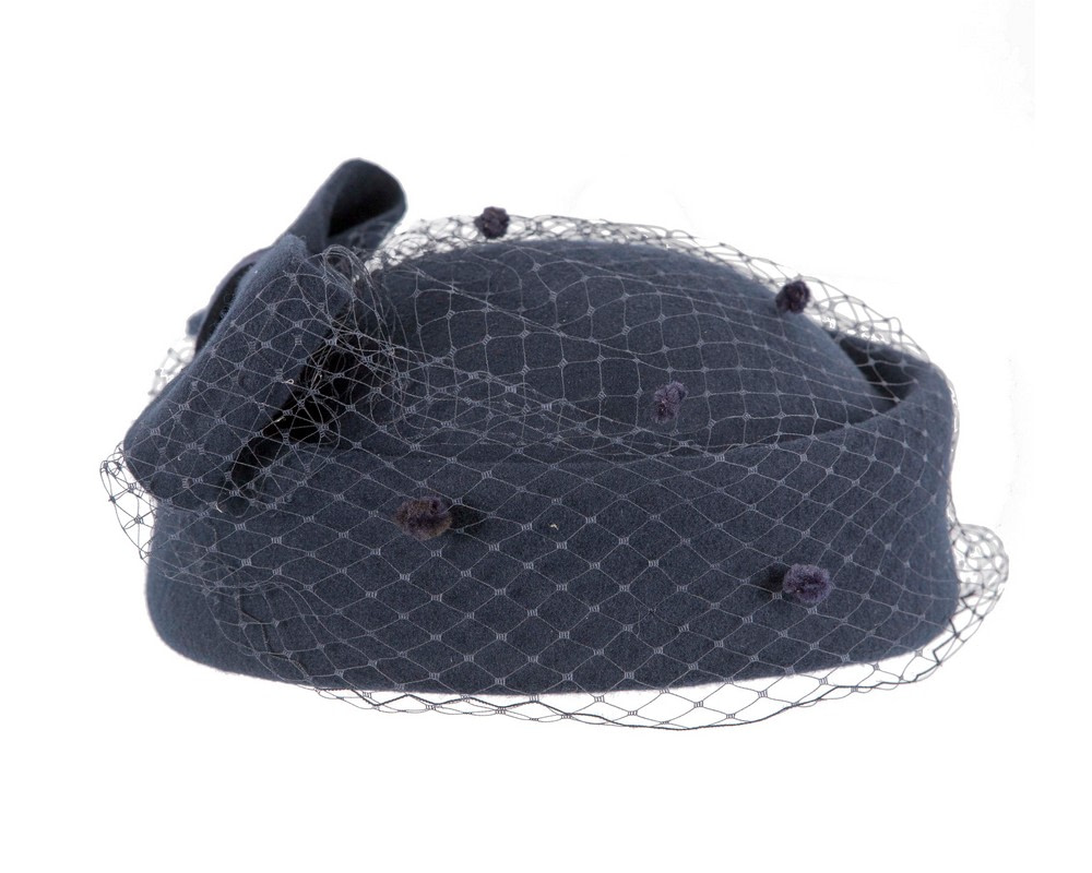 Large navy pillbox hat made form pure wool felt. This elegant fascinator hat has bow at the back and face veil for great look. Great choice for autumn and winter racing event or any special ocassion.