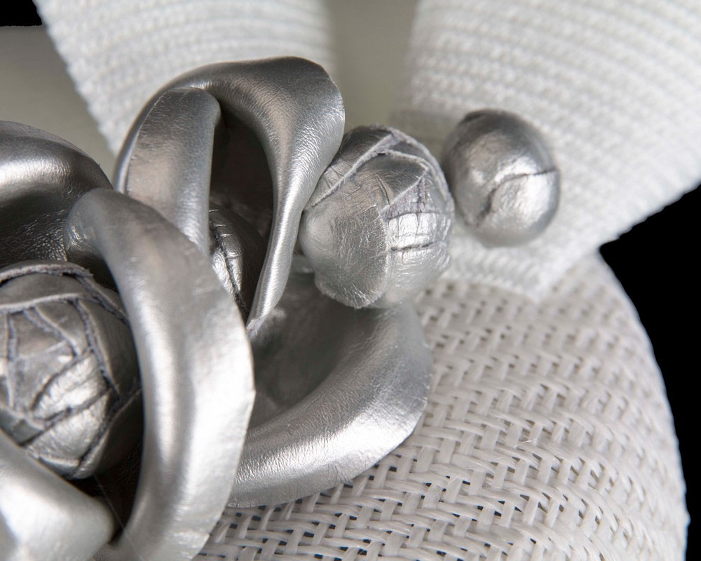 Classic white pillbox base with stylish decoration and contrast silver leather flower arrangement. This fascinator will be a jewel of your next spring racing outfit.